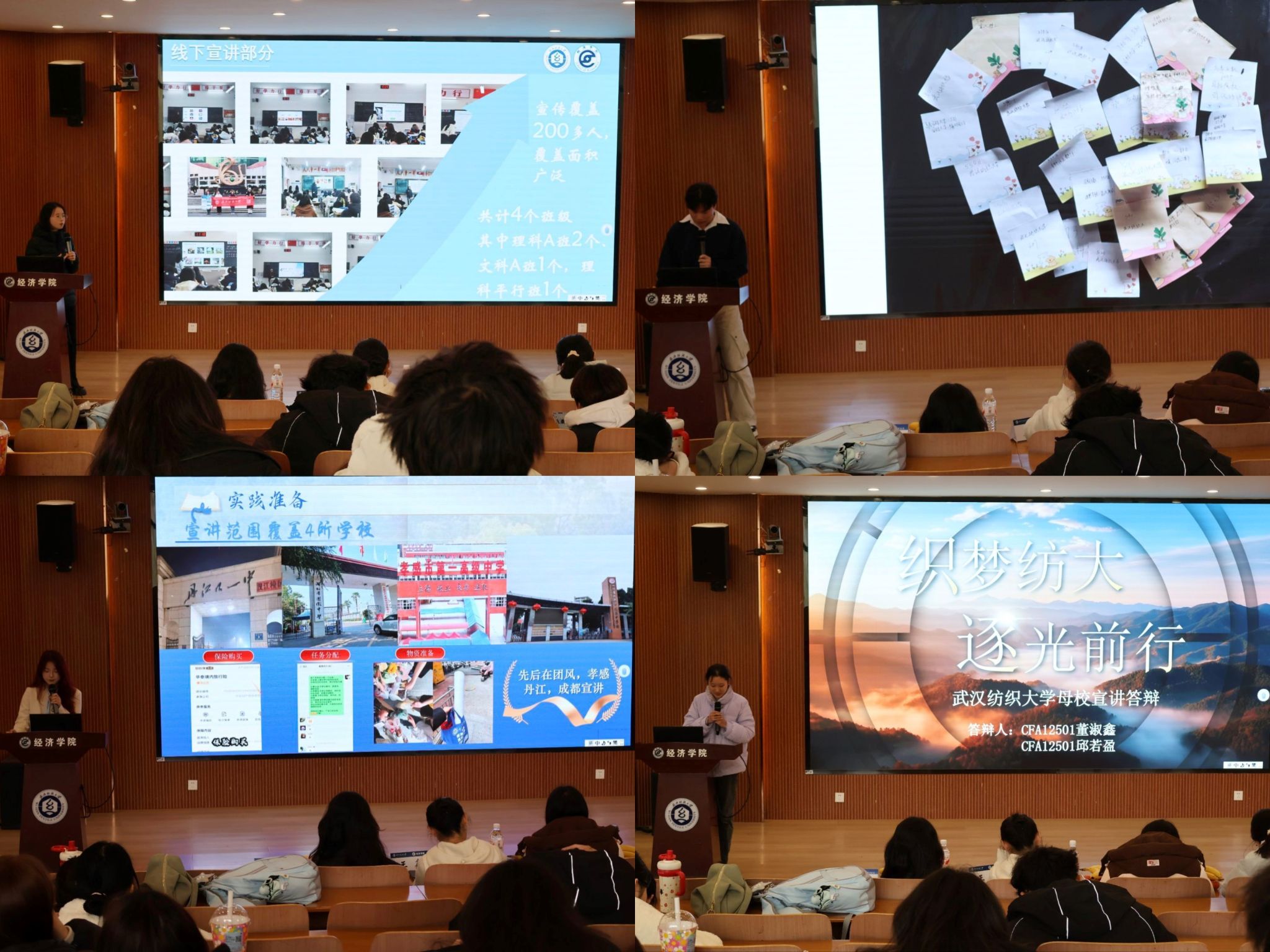 答辩伊始,主持人刘欣阳对赛事规程与评审标准作了系统阐释,明确了成果展示、实践意义及答辩礼仪等方面的具体要求,为答辩工作的有序开展奠定了良好基础。随后,各团队依次进行成果汇报,围绕寒假期间返回高中母校开展宣讲的实际经历,生动呈现了将纺大形象带回母校的具体实践。部分团队深入课堂开展面对面交流,讲述大学学习与成长体悟;部分团队采用线上方式,细致解读招生政策与专业设置,耐心回应学弟学妹的疑问。各团队以丰富多样的形式,将纺大精神与校园文化带回母校,展现了学子知校爱校、感恩回馈的责任意识,也进一步增强了校内外联动的育人实效。